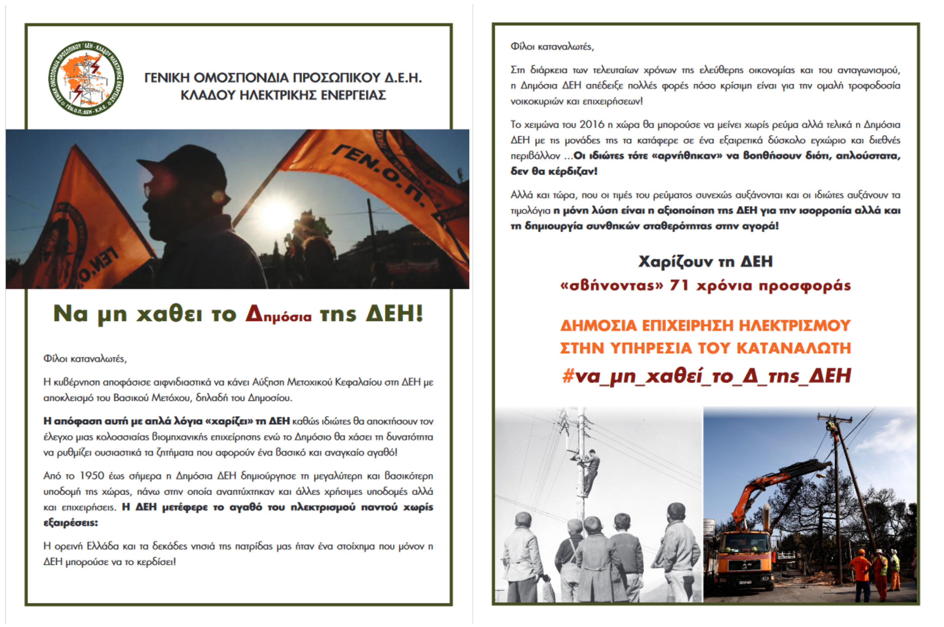 Η κυβέρνηση αποφάσισε αιφνιδιαστικά να κάνει Αύξηση Μετοχικού Κεφαλαίου στη ΔΕΗ με αποκλεισμό του Βασικού Μετόχου, δηλαδή του Δημοσίου. Η απόφαση αυτή με απλά λόγια «χαρίζει» τη ΔΕΗ καθώς ιδιώτες θα αποκτήσουν τον έλεγχο μιας κολοσσιαίας βιομηχανικής επιχείρησης ενώ το Δημόσιο θα χάσει τη δυνατότητα να ρυθμίζει ουσιαστικά τα ζητήματα που αφορούν ένα βασικό και αναγκαίο αγαθό! Από το 1950 έως σήμερα η Δημόσια ΔΕΗ δημιούργησε τη μεγαλύτερη και βασικότερη υποδομή της χώρας, πάνω στην οποία αναπτύχθηκαν και άλλες χρήσιμες υποδομές αλλά και επιχειρήσεις . Η ΔΕΗ μετέφερε το αγαθό του ηλεκτρισμού παντού χωρίς εξαιρέσεις: Η ορεινή Ελλάδα και τα δεκάδες νησιά της πατρίδας μας ήταν ένα στοίχημα που μόνον η ΔΕΗ μπορούσε να το κερδίσει!